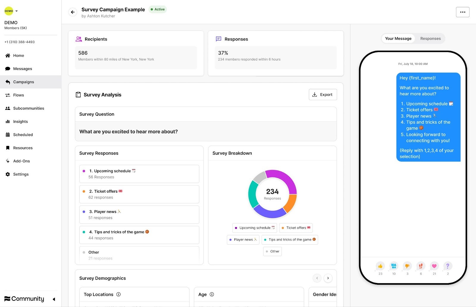 - After sending, go to the Campaign Details page to see response breakdowns (counts + %) and visual charts.