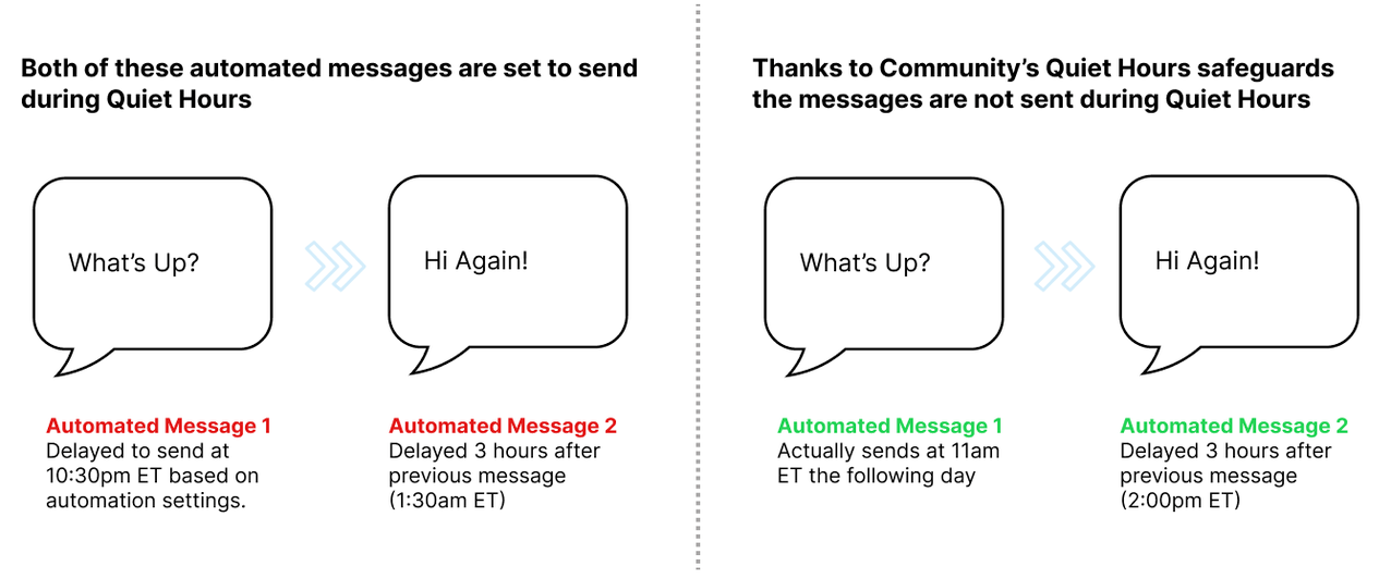 For messages sent through the Community API, Quiet Hours Warning is automatically enforced by default to prevent outbound messages from being delivered during restricted hours. Any time outside of 11:00 a.m. ET to 8:00 p.m. ET (U.S.) is considered Quiet Hours, and messages submitted during this period will be queued and automatically sent once Quiet Hours end. To bypass this behavior (for example, to send a transactional or non-marketing message), include the parameter “override_quiet_hours”: true in your API request. By setting this parameter, you acknowledge responsibility for ensuring that the message complies with all applicable laws and regulations, including the Telephone Consumer Protection Act (TCPA). For more information, see the Send Message API documentation.